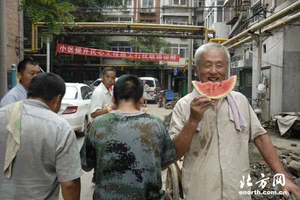 连日的高温酷暑让人们酷热难耐,当天正值立秋,按照传统习俗都要吃西瓜,不但能消除夏天的暑热,而且还可免除冬天和来春的腹泻。当工人们正干得汗流浃背的时候,志愿者们送来了西瓜,“慰劳”辛苦在高温下的他们。工人张师傅告诉记者,虽然天津炎热,而且很累,但是志愿者的行动却为他们带来了一丝清凉,让他们感觉到天津大家庭的温暖,心里美滋滋的。要更好地为社区居民服务,为建设美丽社区、美丽天津献出自己的一份力。