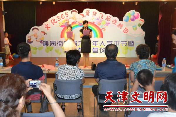 7月11日,桃园街举办了“童梦飞扬”桃园街首届未成年人艺术节暨夏令营开营仪式活动。仪式上该街对积极参与社区活动表现突出的美德少年进行表彰,向外来务工人员子女赠送了学习用品。社区青少年们进行形式多样的才艺展示,既有京剧、蒙古舞、天津快板等富有民族特色的传统表演,又有诗朗诵、拉丁舞、大合唱等富有西方风情的现代演出,特别是外来务工人员子女也将带来充满活力的街舞表演。孩子们还将亲手制作的丝网花献给无私奉献的社区优秀辅导员。此次活动丰富了桃园地区广大社区未成年人的暑期生活,展示桃园街青少年良好风貌,提高其参与社区活动的热情,激发热爱社区的情感。