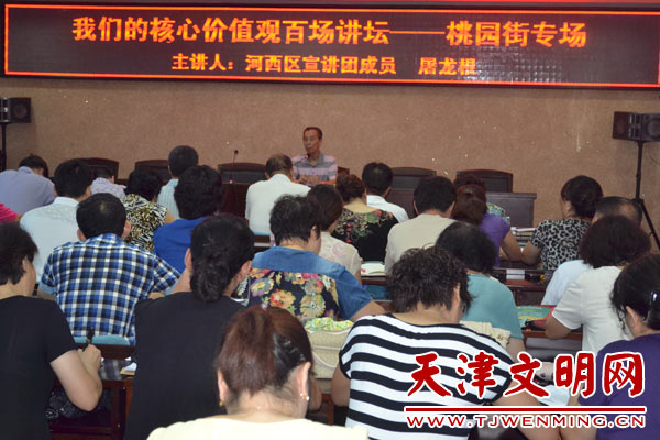 桃园街党员干部、社区居委会主任、街宣讲团成员等近80人聆听了讲座。讲座中互动频繁、气氛热烈,广大党员干部深受教育。(河西区文明办2014)
