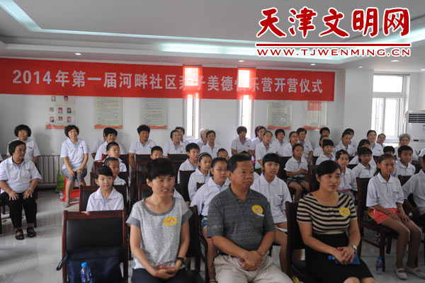 7月18日上午,津南区双港镇河畔社区首届亲子美德快乐营热闹开营,参加活动的家长、孩子共计80余人。