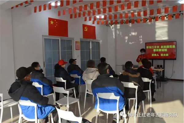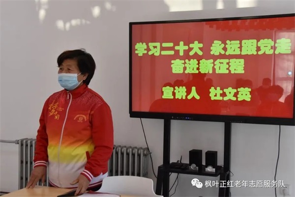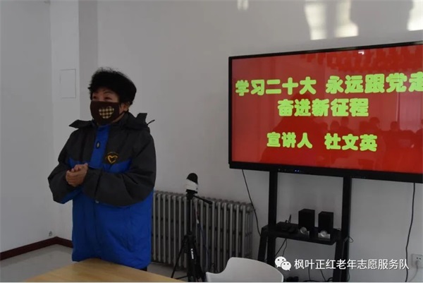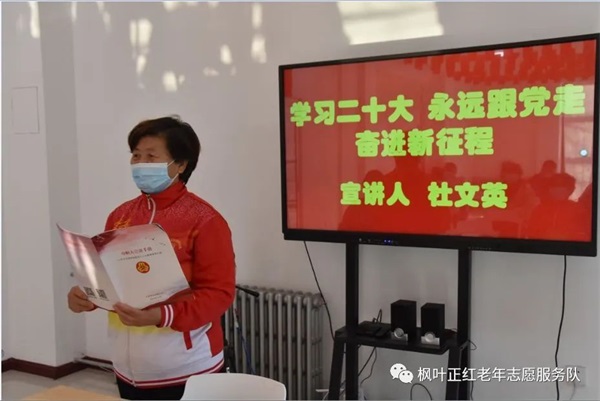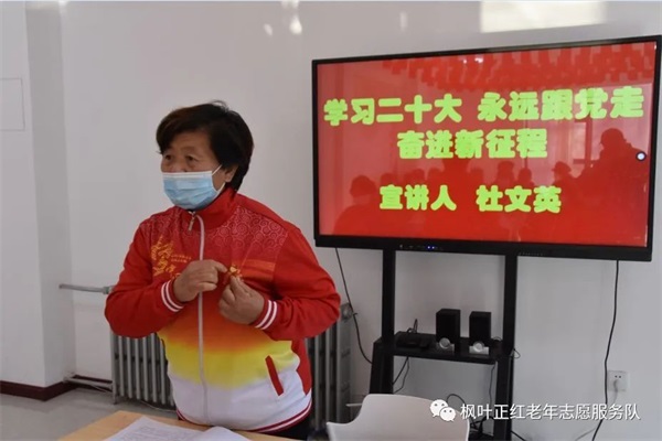 近日,枫叶团队组织部分志愿者在社区新时代文明实践站,开展了“学习宣传贯彻党的二十大精神·巾帼志愿者在行动”主题宣讲活动。枫叶团队党员巾帼志愿者、天津好人荣誉获得者杜文英主讲,刘惠环、王长慧等巾帼志愿者也都浅谈了自己的学习体会。
