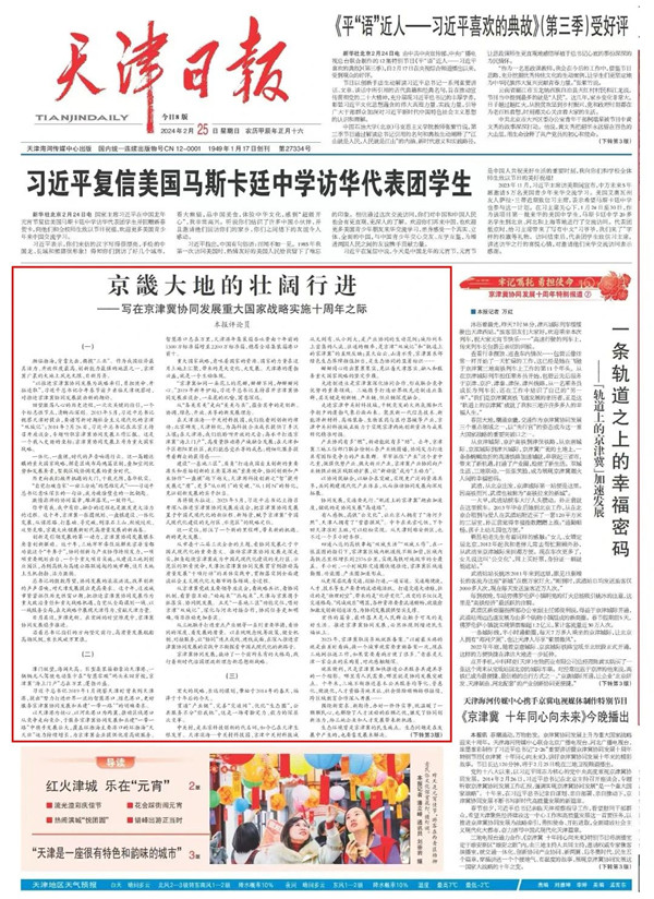 今年春节前夕,习近平总书记亲临天津视察指导工作,对新时代新征程上天津工作提出总体要求和“四个善作善成”的重要要求,京津冀协同发展的战略部署蕴含其中。