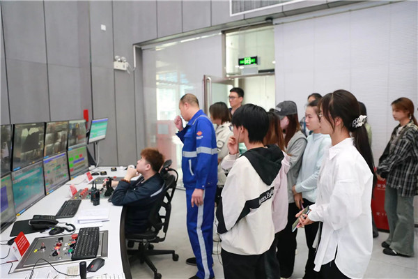 走进作业区,路面干净整洁看不到煤粉煤渣,呈现在学子们眼前的是一派赏心悦目的绿色景象。在智慧管控中心,学子们参观了柔性管控系统,看到了员工通过鼠标轻点、对讲机协调,煤炭就可实现翻、堆、取、装全天候自动控制。在翻车机房和码头前沿,看到了翻车机底部洒水工艺以及洗带装置等,感受到了央企智能化、绿色化的“硬核”魅力。