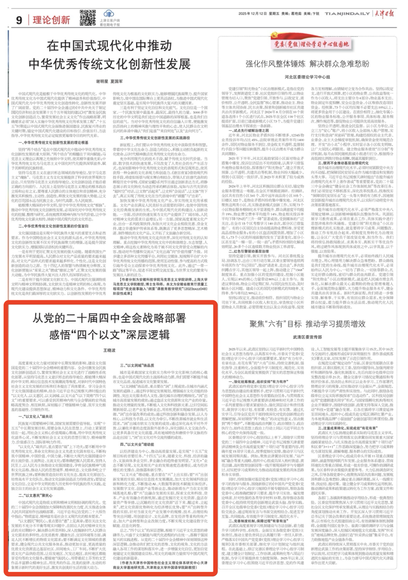 总之,“四个以文”的深层逻辑,根植于习近平文化思想的磅礴伟力,兴盛于文化赋能与现代化进程的内在统一,落脚于强国复兴的实践进程。从党的二十届四中全会精神中深刻领悟这种深层逻辑,会推动我们把文化的思维、文化的视角、文化的方法融入各项工作的谋划和落实中,进一步增强文化自信,更加自觉地锚定文化强国建设目标,用文化的雄浑力量续写中国式现代化建设的新篇章。(作者:王晓波,天津市中国特色社会主义理论体系研究中心天津商业大学基地研究员、天津商业大学外国语学院副教授)