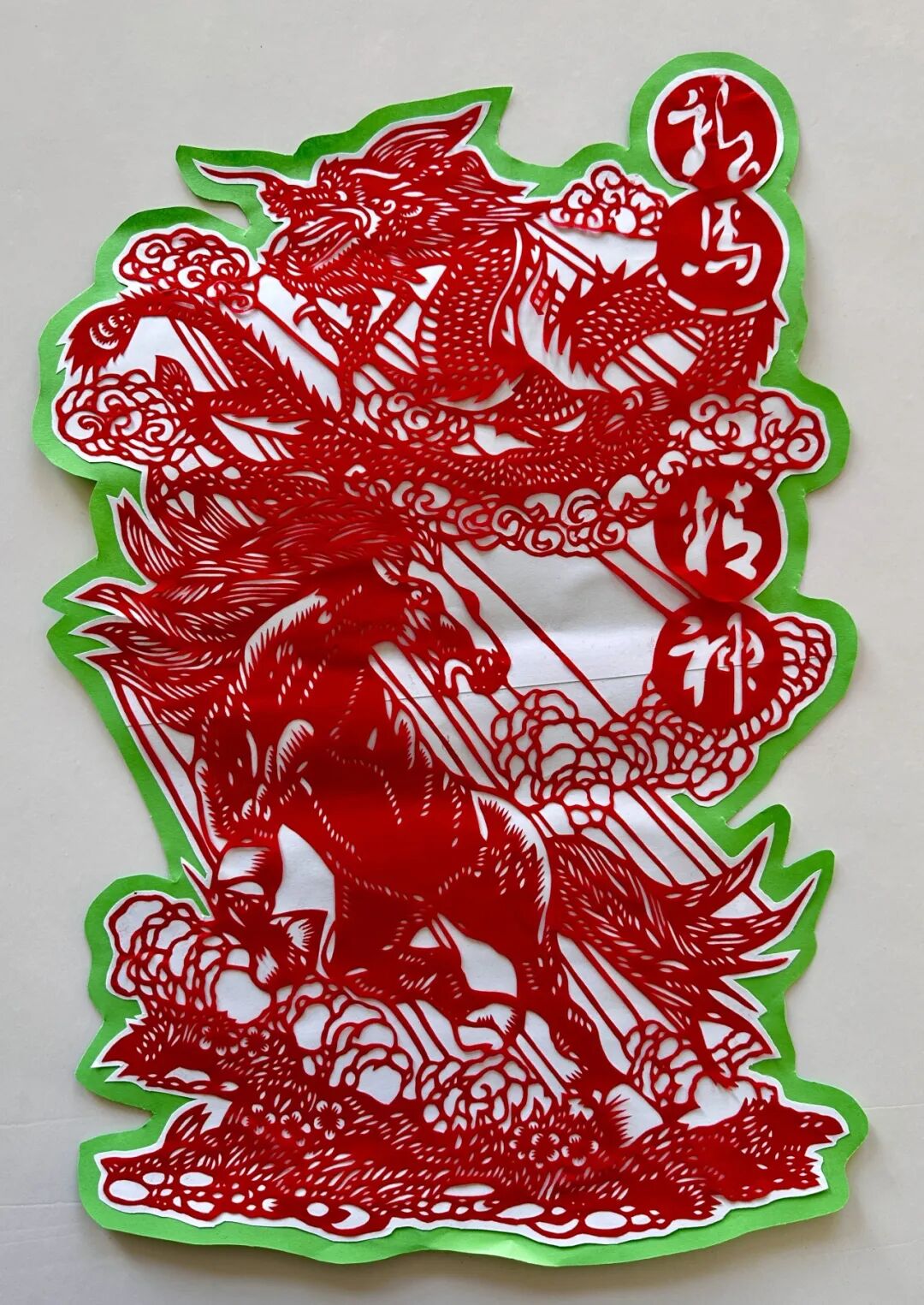 《龙马精神》以传统文化符号为核心,将龙的威严矫健与马的昂扬奋进完美融合。作品借鉴传统剪纸的灵动韵律,选用象征家国情怀的中国红为主色调,传统非遗工艺与现代艺术表现手法碰撞出独特火花。一笔一划间,既呼应了非遗文化传承的教学内核,更彰显出新时代少年自强不息、奋勇争先的精神风貌,让观者深切体悟“龙马精神”所承载的坚韧不拔、积极进取的文化内涵。