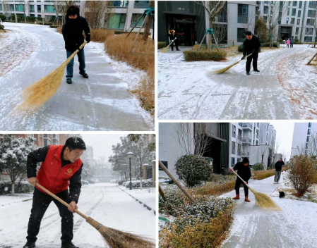 凛冽寒风中,党员干部率先垂范,手持铁锹、扫帚冲锋在前,以“领头雁”姿态攻坚主干道与坡道厚雪区域;物业团队分工协作,推雪板与铁锹默契配合,高效清理小区出入口、单元门前等重点区域;志愿者们不畏严寒,穿梭在园区各个角落,细致清扫人行步道的浮雪与残冰。鲜红的党徽、醒目的志愿红与皑皑白雪相映成景,构成冬日里最温暖的风景线。
