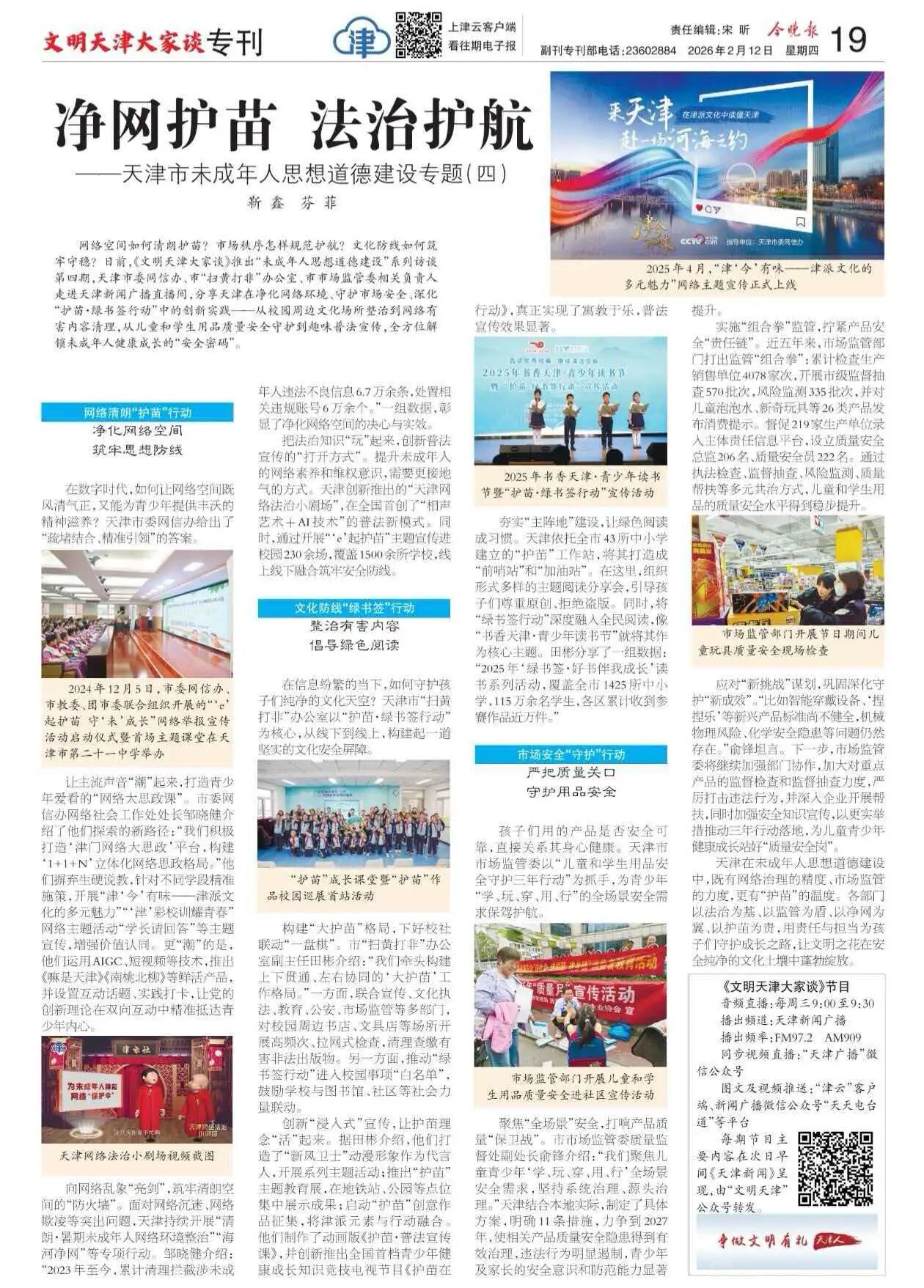天津在未成年人思想道德建设中,既有网络治理的精度、市场监管的力度,更有“护苗”的温度。各部门以法治为基、以监管为盾、以净网为翼、以护苗为责,用责任与担当为孩子们守护成长之路,让文明之花在安全纯净的文化土壤中蓬勃绽放。