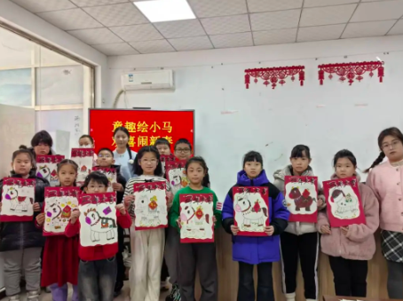 活动现场,色彩斑斓的画纸整齐铺展,美术老师耐心授课,不仅为孩子们讲解“龙马精神”的吉祥寓意、传统年画中小马的象征意义,还手把手指导大家用线条勾勒小马灵动姿态,用色彩渲染新春喜庆氛围。