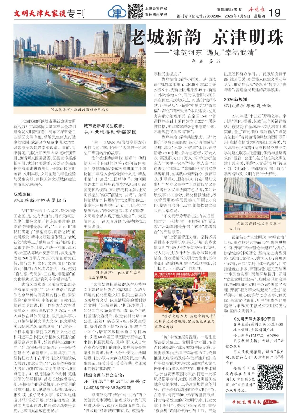 老城区如何以城市更新焕活文明新活力?京津冀桥头堡怎样以全域创建绘就文明新画卷?河东区深耕老工业城区文明底蕴,破解民生痛点打造津韵家园;武清区立足京津明珠定位,以常态长效建设幸福武清。日前,天津新闻广播《文明天津大家谈》特别节目,邀请河东区委常委、区委宣传部部长李川,武清区委常委、区委宣传部部长汪海军走进直播间,分享两区文明培育、文明实践、文明创建的特色经验与民生实效,共探天津文明城区建设高质量发展路径。
